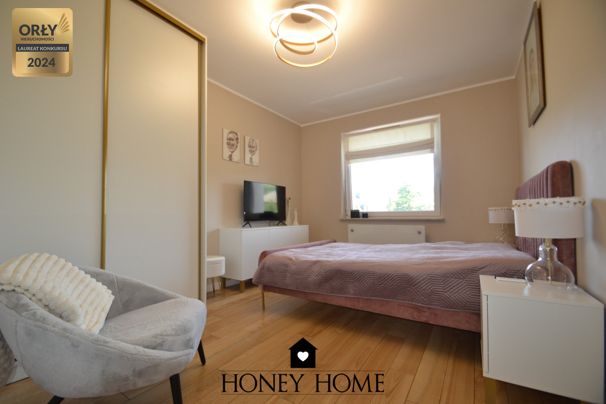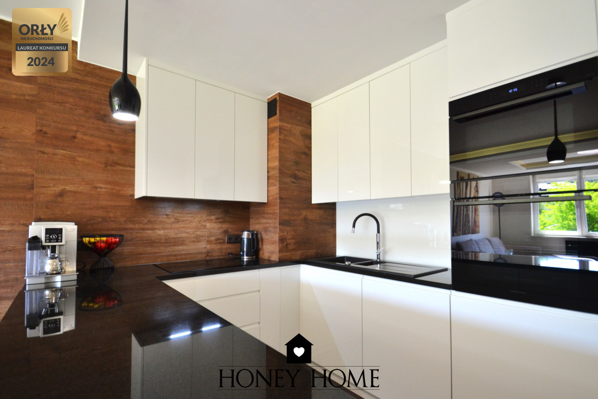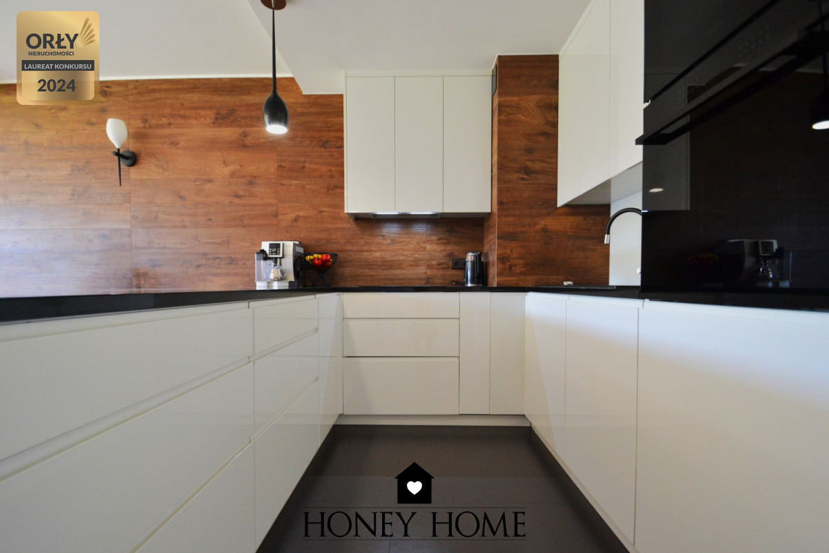 Nowoczesna kuchnia z nowymi sprzętami AGD, oddzielna garderoba oraz duże szafy gwarantujące wygodę i dużo miejsca do przechowywania.