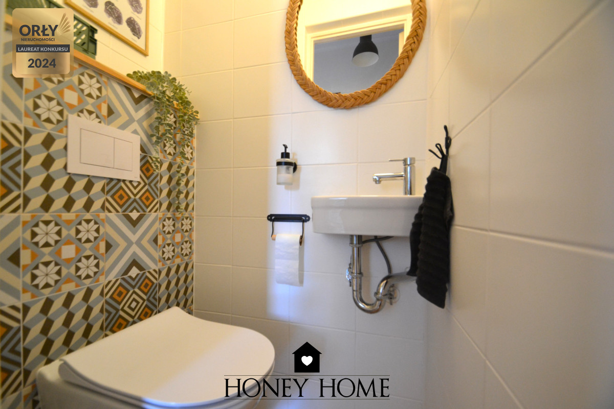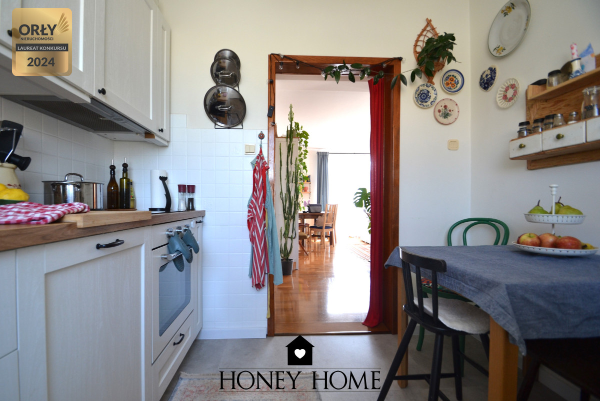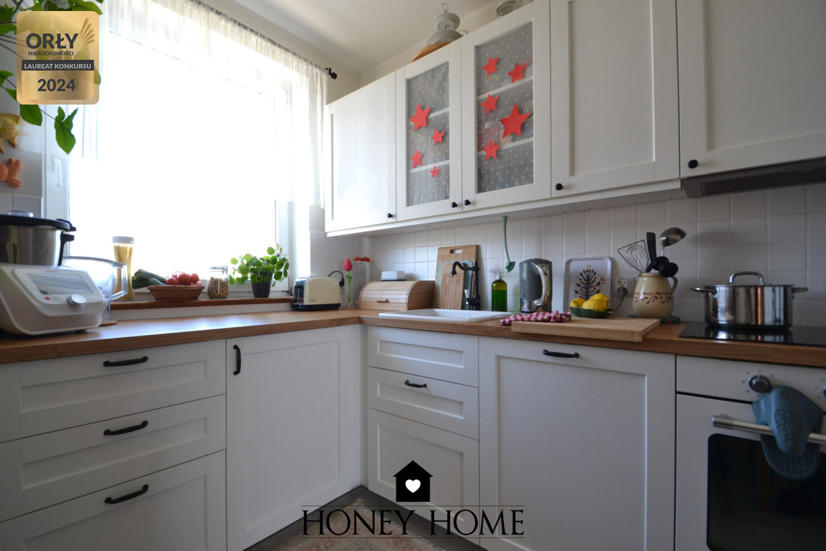 Kuchnia przeszła remont. Na podłogach znajduje się elegancka deska. Mieszkanie ogrzewane jest piecem gazowym dwufunkcyjnym marki Viessmann.