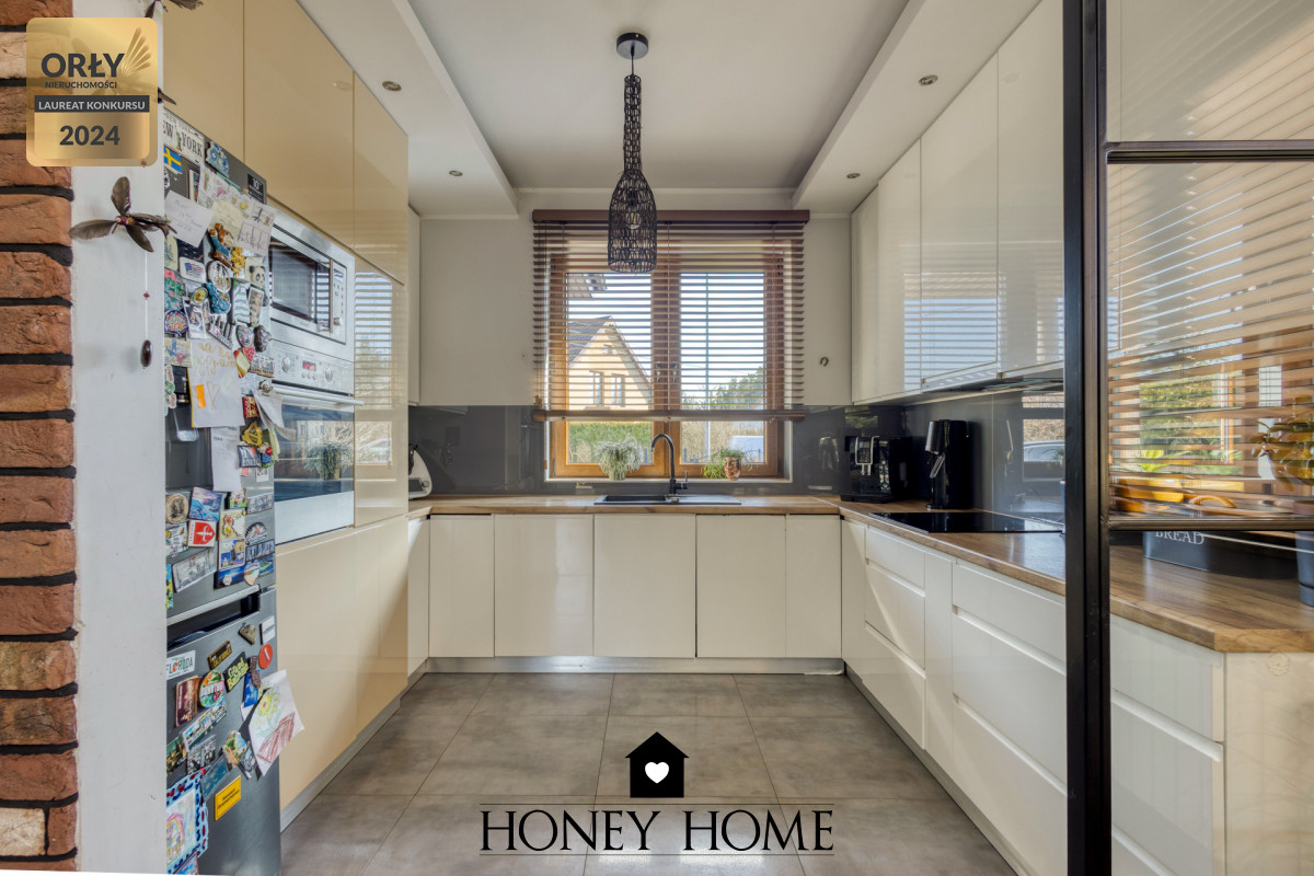 - Kuchnia: Półzamknięta, wyposażona w duże okno oraz przeszkloną ścianę, co nadaje wnętrzu nowoczesny charakter.