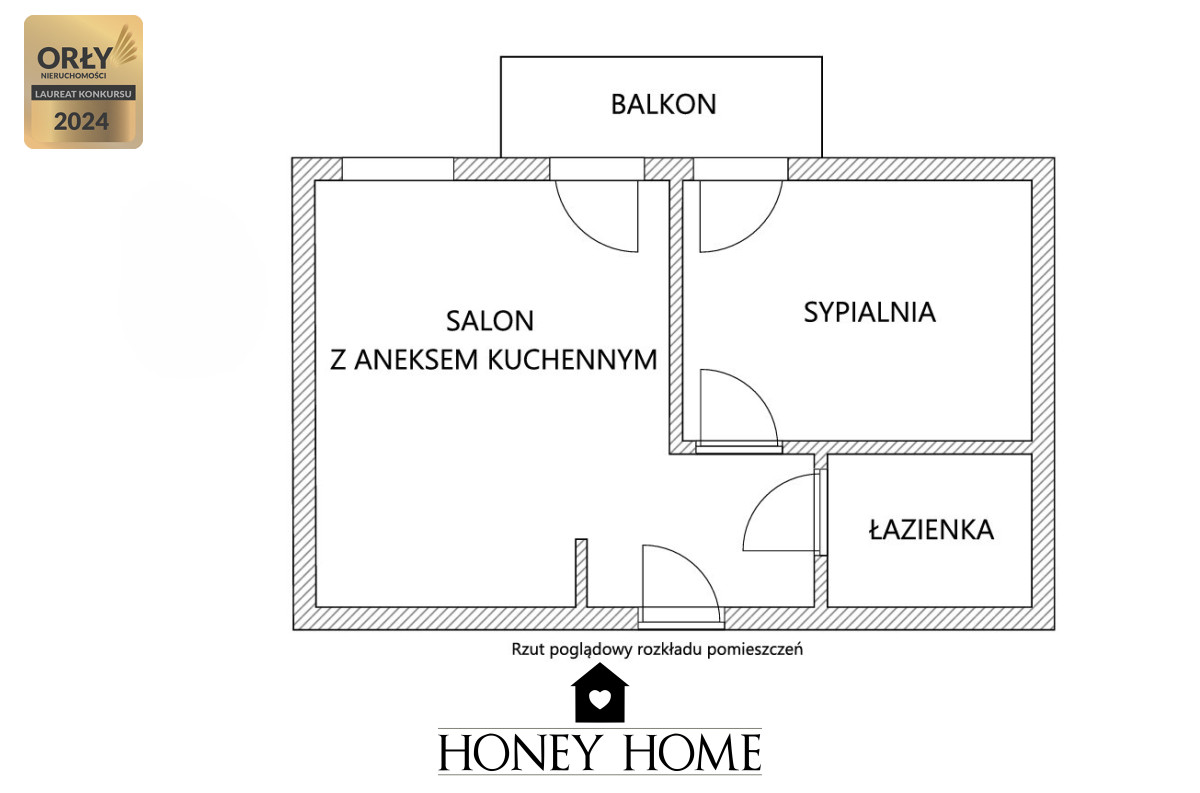 To funkcjonalny układ wnętrza z salonem z aneksem kuchennym i osobną sypialnią.