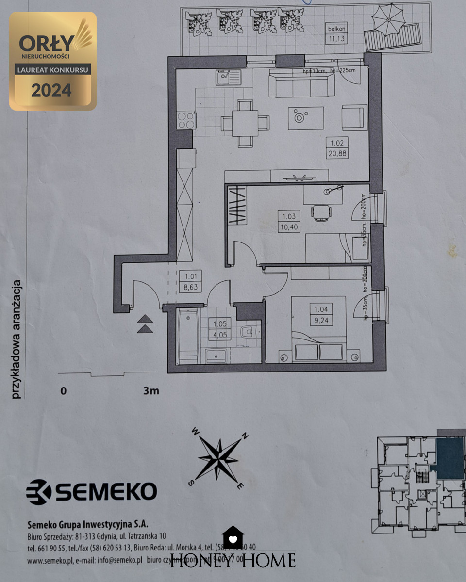 Nieruchomość o powierzchni 53,20 m2 w nowym budownictwie z połączoną kuchnią i saloniem. Ekspozycja okien jest południowo wschodnia. Przestronny balkon z widokiem na pola, aquapark oraz lasy.
